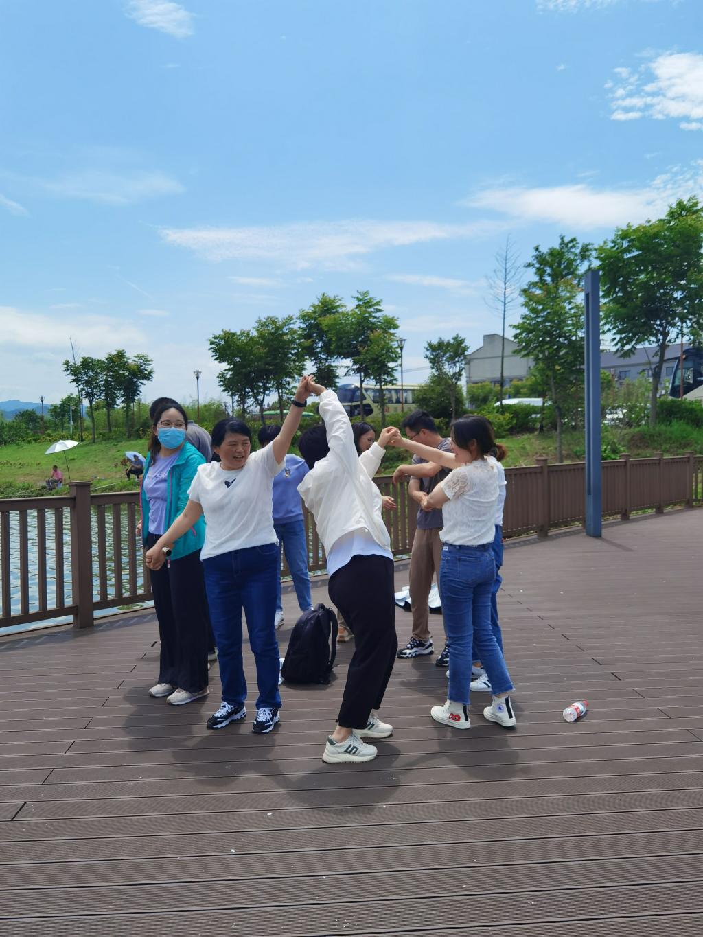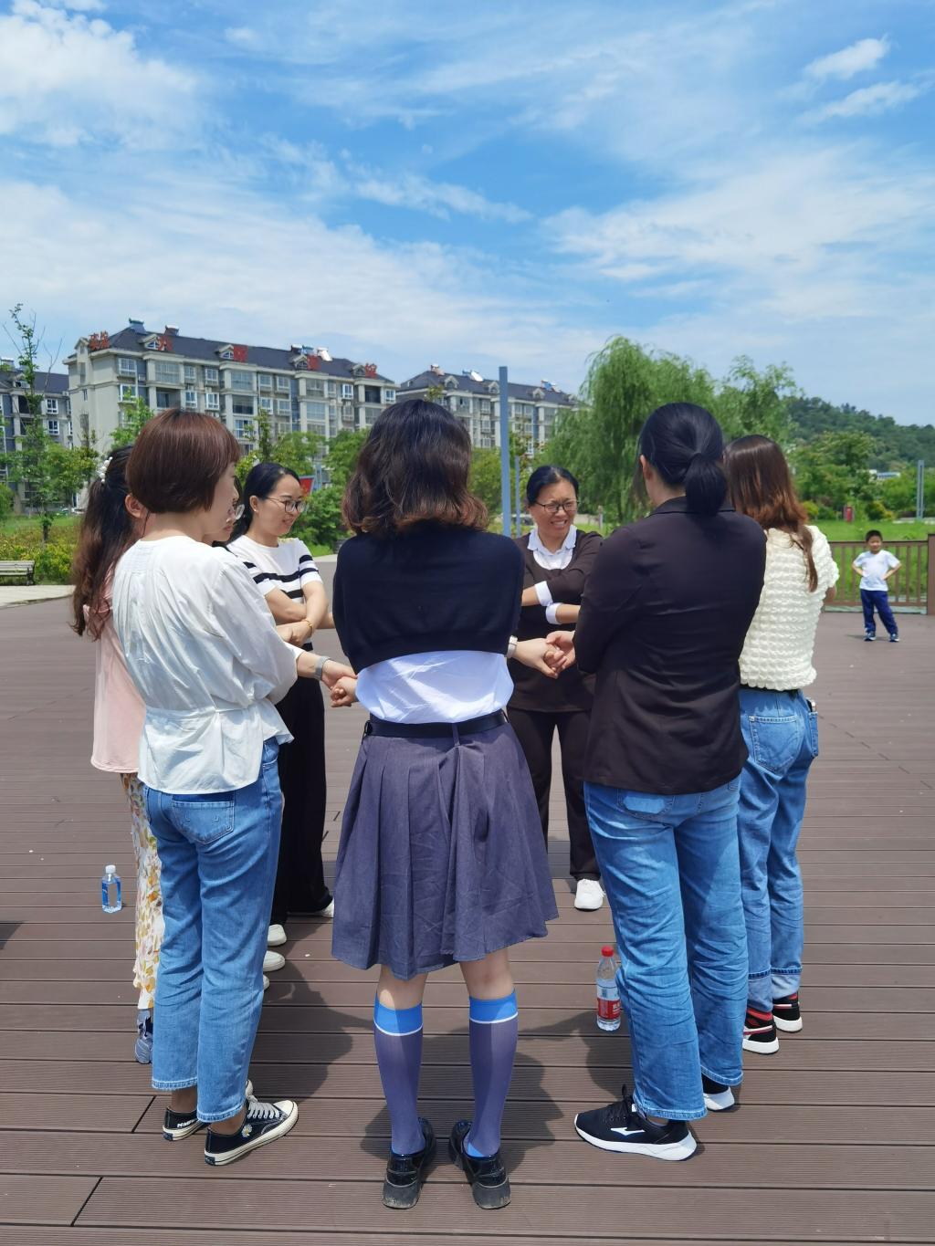 活动在“解手链”中结束。教师们双手交叉结成了一张亲密无间、紧紧相连的网,大家通过跨、转、钻的方式,将这张网解开,锻炼了教师的合作意识和团队协作能力。