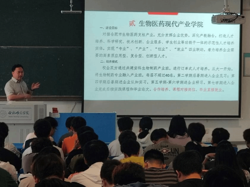 随后,陈金武详细介绍了现代产业学院在课程设置、师资力量、实践教学等方面情况,以及合作企业——安科生物的发展历史及现状,并就学生未来的就业前景和发展方向进行了深入剖析。他通过生动的案例和详实的数据,展示了现代产业学院在人才培养上的强大实力和创新能力。