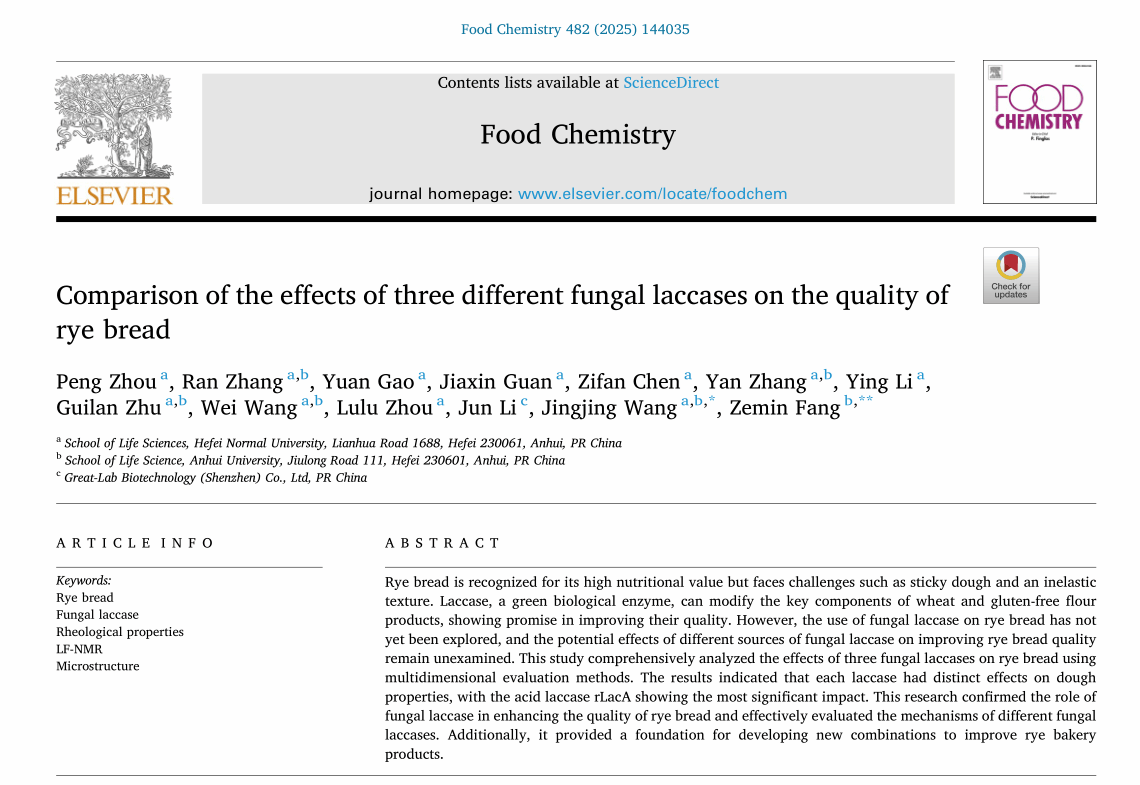 近日,永利集团304am登录王晶晶教授和周鹏老师团队与安徽大学生命科学学院等单位合作,在国际知名期刊《Food Chemistry》(中科院一区Top期刊)上以永利集团304am登录为第一单位发表了题为“Comparison of the effects of three different fungal laccases on the quality of rye bread”的研究成果(论文DOI:10.1016/j.foodchem.2025.144035)。永利集团304am登录周鹏老师为论文第一作者,王晶晶教授为通讯作者,2021级生物科学专业高远、2021级生物技术专业陈子凡和2022级生物技术专业关佳欣等同学为共同作者,均参与了此研究的重要工作。本研究得到了国家自然科学基金、安徽省高等学校自然科学基金、永利集团304am登录高层次人才引进项目及企业技术开发委托项目的资助。
