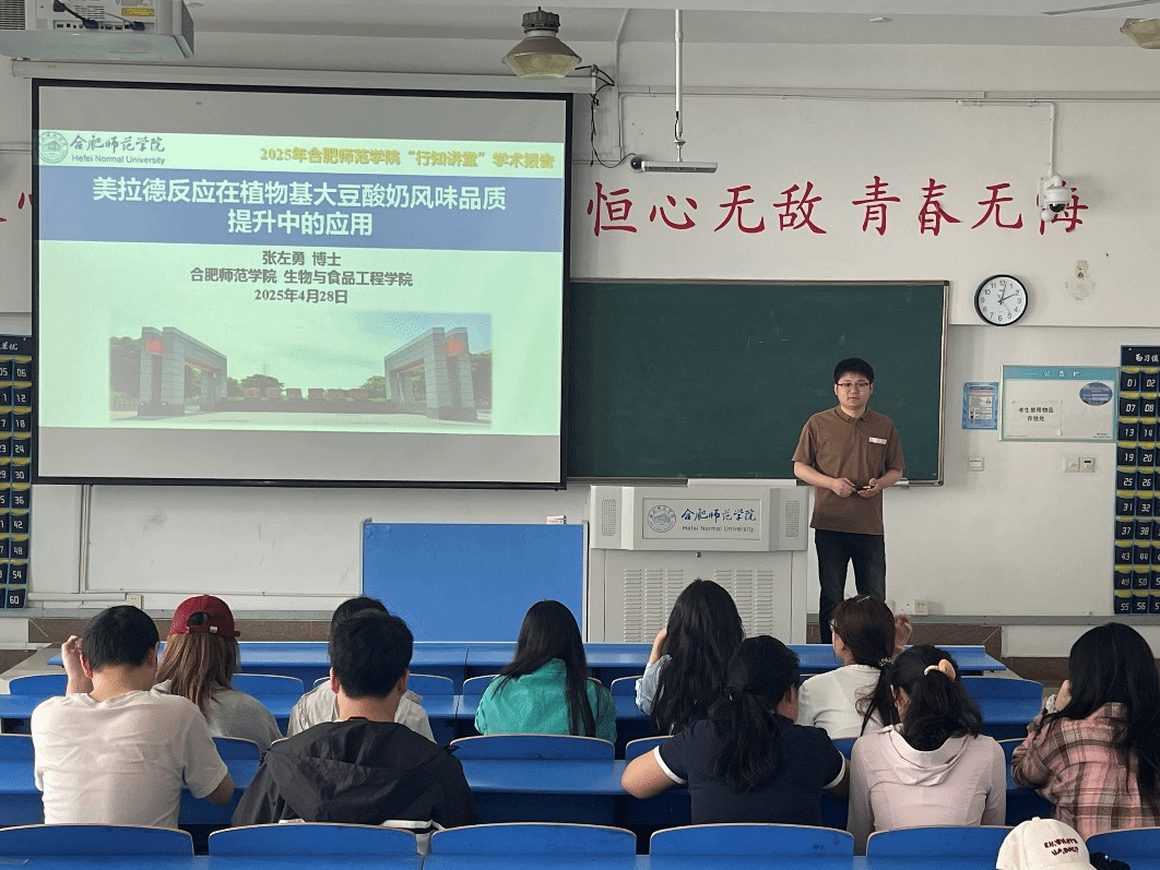 4月28日下午,永利集团304am登录张左勇博士在锦绣校区逸夫楼A306教室作题为《美拉德反应在植物基大豆酸奶风味品质提升中的应用研究》行知讲座。学院副院长陈金武教授现场指导,食品质量与安全专业学生代表参加了此次报告。