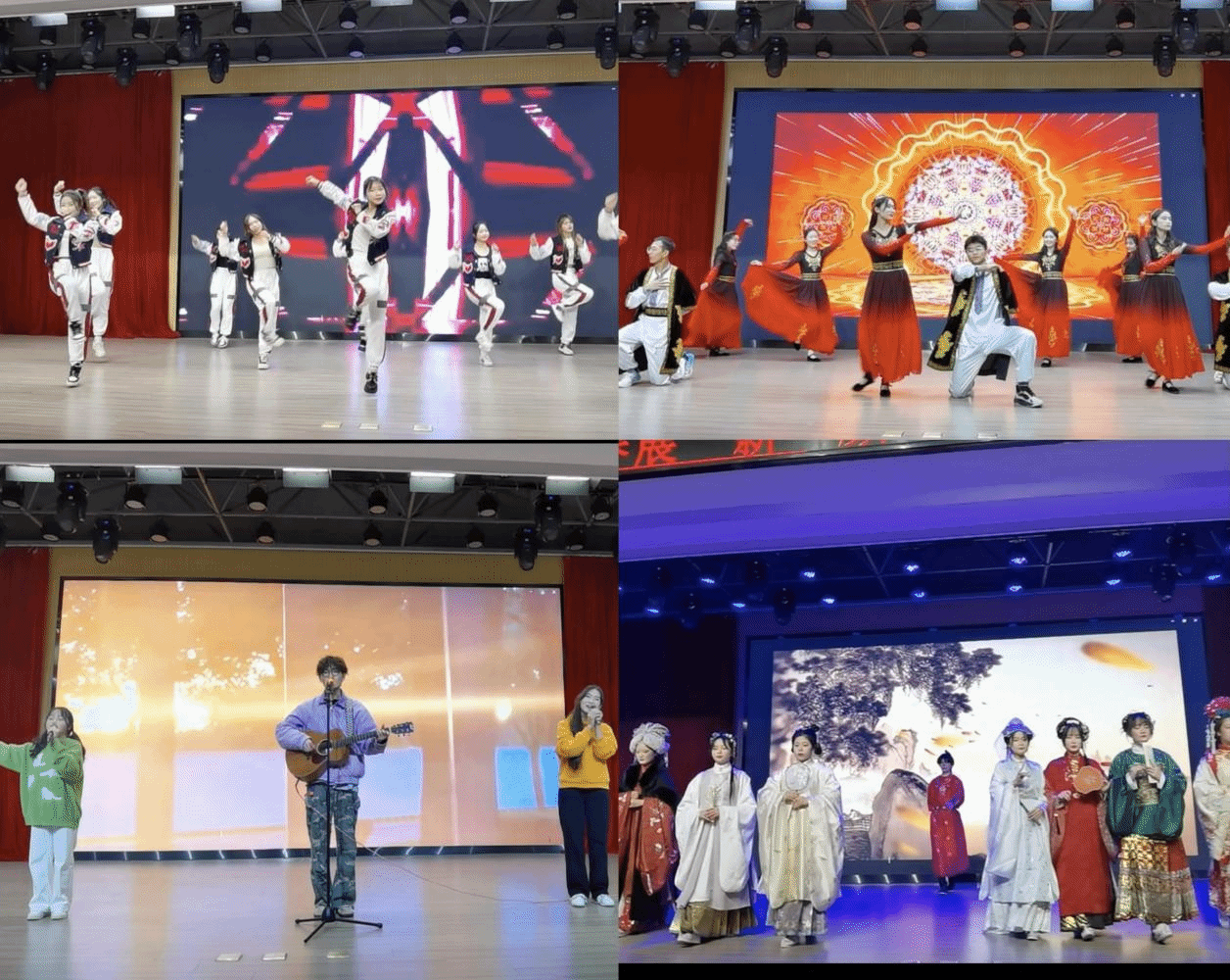 晚会第一篇章“梦想起航,初相遇”。吉他弹唱《晴天》,表演者用动听的歌声和娴熟的吉他演奏将观众带入了一个充满青春回忆的氛围。汉服走秀《红楼梦》踏歌汉文化协会的表演者们身着精美的汉服,一颦一笑间尽显古典韵味,仿佛带领观众穿越回了红楼梦境。新疆舞《月光》用热情奔放的舞姿展示了新疆独特的民族风情,赢得了台下观众的阵阵掌声。小品《咋咋呼呼》幽默的情节和生动的表演把晚会推向高潮,全场笑声不断,让反诈宣传深入人心。