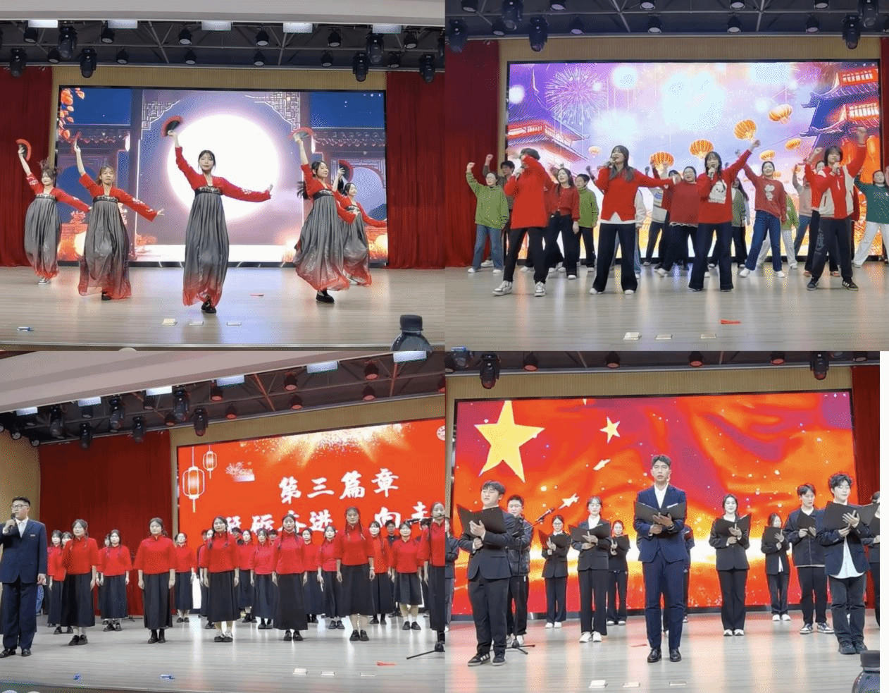 第三篇章“砥砺奋进,向未来”。舞蹈《寄明月》中,同学们用优美的舞姿演绎出了古风与现代舞的完美融合。大合唱《万疆》辅导员徐浩然和同学们用深情的歌声唱出了对祖国的热爱和自豪。最后,彩蛋舞蹈由学生会全体成员表演,欢快的节奏和整齐的舞蹈动作为晚会画上了圆满的句号。