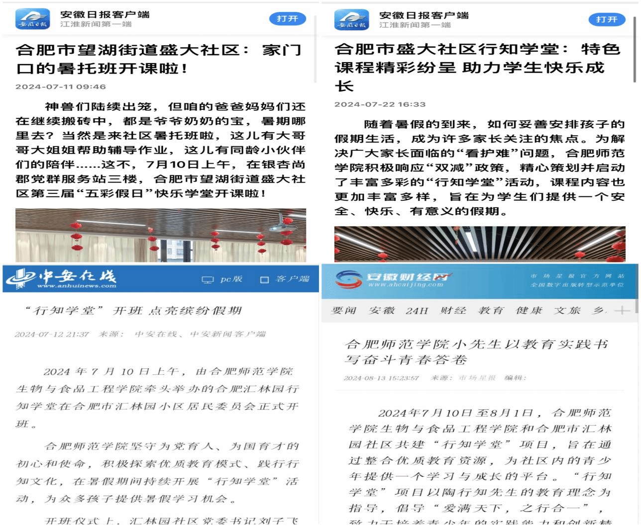 天都行知学堂获《中青校园》、《安徽日报》、《大皖新闻》 等媒体相继报道10次。卫塘社区行知学堂获《中青校园》《大皖新闻》《掌中安徽》等媒体相继报道10次。盛大社区行知学堂获《安徽日报》《中青校媒·安徽》等媒体相继报道7次。汇林园行知学堂获《安徽日报》《安徽财经网》等媒体相继报道7次。池州东至尧舜明德行知学堂获中国关工委、池州关工委、中安在线等6家媒体相继报道。